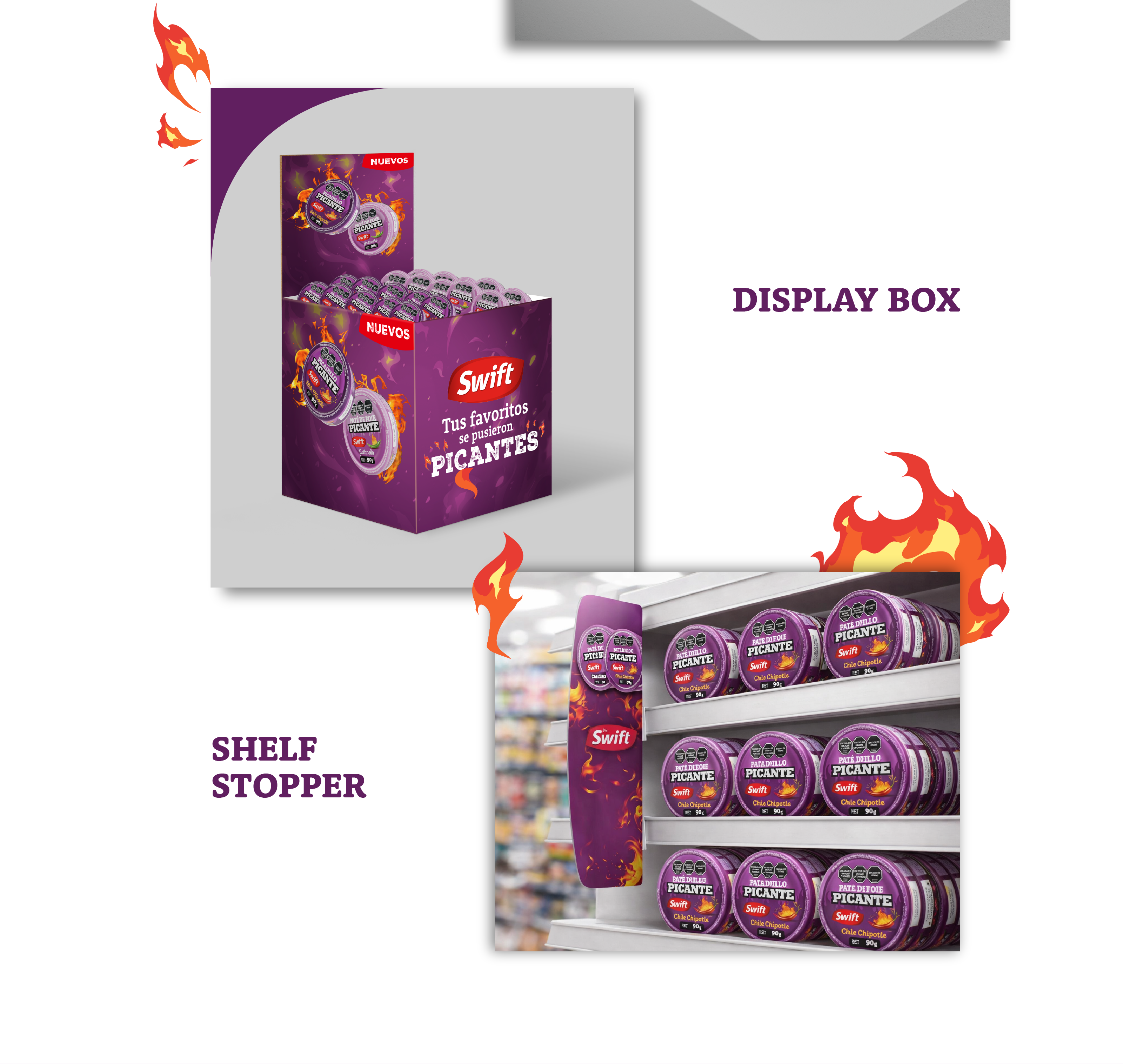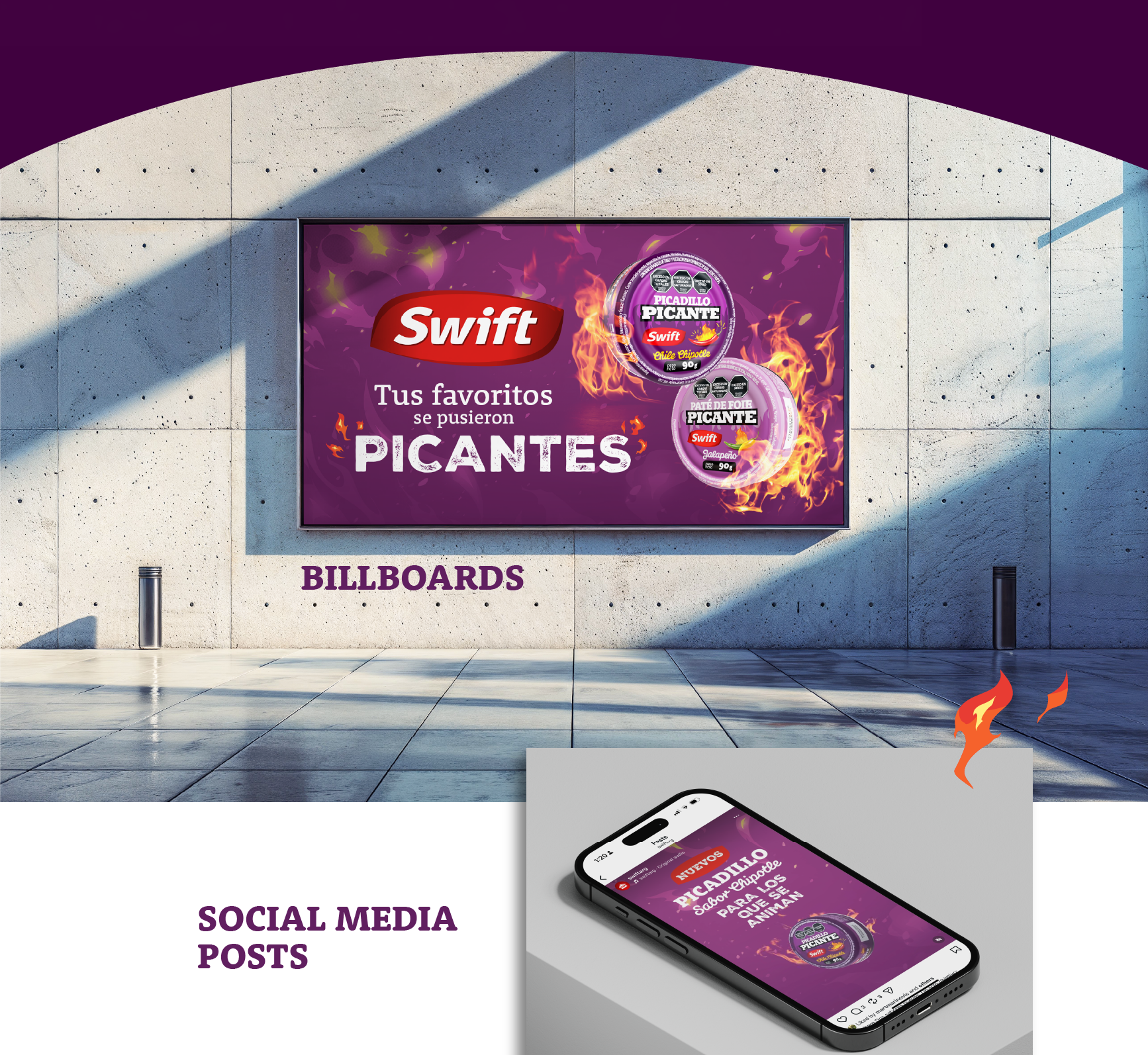 Creamos una campaña para presentar las nuevas versiones picantes de los untables SWIFT, aportando una mirada fresca, divertida y llamativa al producto original. El foco estuvo en comunicar la innovación desde un tono lúdico, invitando a descubrir el picante de una forma descontracturada y atractiva. Con una estética vibrante y dinámica, buscamos que la campaña se sienta moderna, atractiva y fácil de identificar en cualquier formato.